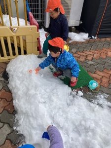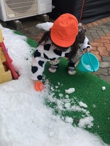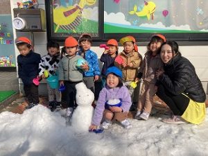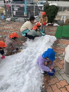 みんなで雪だるまも作りました⛄目をつけると、「口がないよ~」と口になるものを探してきてくれましたよ!