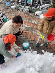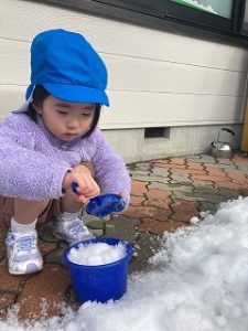 バケツにたくさん雪を入れたり、ケーキを作ったりと雪遊びに夢中なあひる組さんです✨