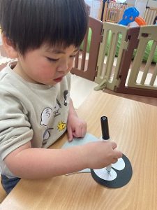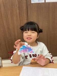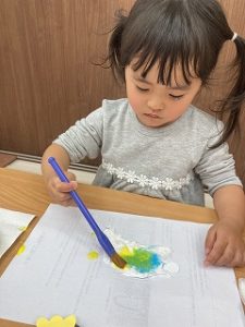 帽子の色は絵の具を2色選び、にじみ絵を楽しみました